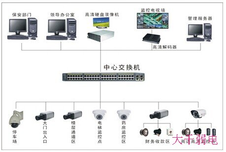 (2)传输系统是指摄像机的视频线接入到网络视频服务器的输入端,它对高清网络视频监控系统的组建至关重要,传输线缆采用屏蔽或者非屏蔽双绞线线缆,它抗干扰能力强,不易受传输线路信号衰减的影响,而且能够加密传输,如果前端设备到后台距离超过90米的话,可以采用光纤通过光端机中转传输信号。 (3)后端平台主要包括录硬盘像机、服务器、交换机、矩阵解码器及显示设备等组成。监控服务器完成监控设备管理、用户管理、报警管理等功能,对图像进行监视、查询、录像和录像回放等功能,网络视频监控能给用户可以提供异地访问的功能。